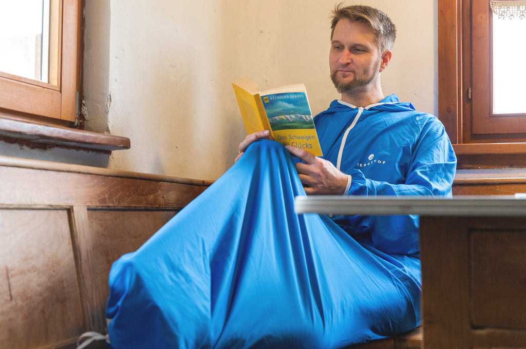 Even stuck at home during lockdowns there are plenty of chances to utilize our wearable sleeping bags. Lounge around on the couch, watching TV or reading a book, the arms and hand opening keep you warm and allow you to flip the pages or the channels. You can also enjoy your balcony all year round, while doing yoga or meditation the hood and windproof fabric protects head and body. To walk around you can quickly open the bottom and button it up, but 3 pockets make sure that you don’t need to go search your phone. Indoor sleeping bags as our SilkLiner can be used as pajama, better than a jumpsuit because it keeps your feet warm and is easier to go to the bathroom with. It also doubles as a bathrobe or a super-long hoodie you can wear all day around the house. No need to think how to dress anymore! Have a look below at some of our products and a click on the title will bring you to the detail pages.